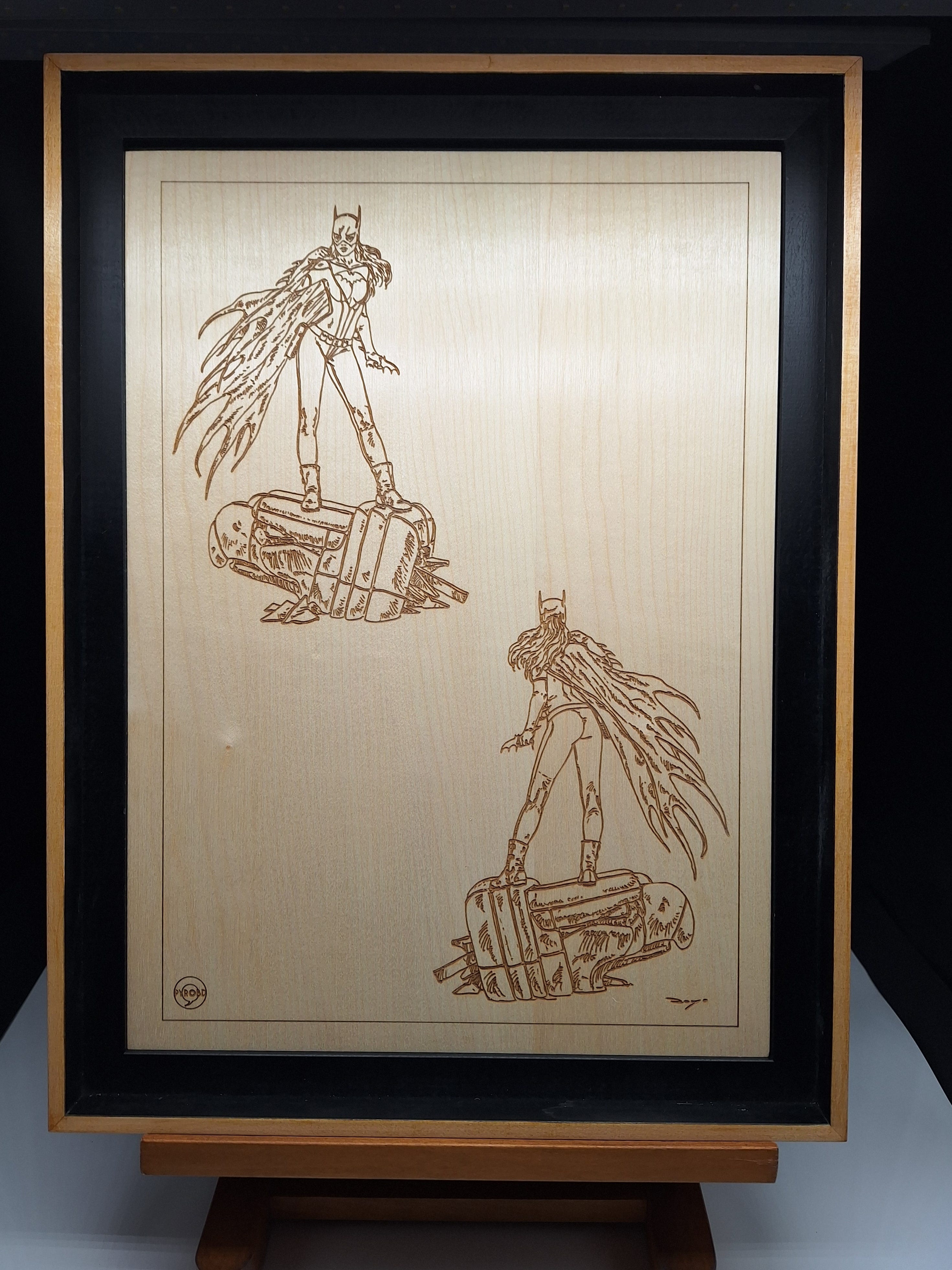 Ce tableau réalisé d’après deux dessins séparés et regroupés, est gravé sur de l’érable sycomore massif de 5mm d’épaisseur, numérotée de 1 à 8. Il représente la Batgirl imaginée par Luis Royo. Elle se distingue par une esthétique puissante, sombre et sensuelle, typique du maître espagnol. Sous son pinceau, l’héroïne gagne une dimension presque mythique : une silhouette élancée, des textures métalliques subtiles et une atmosphère chargée de mystère.