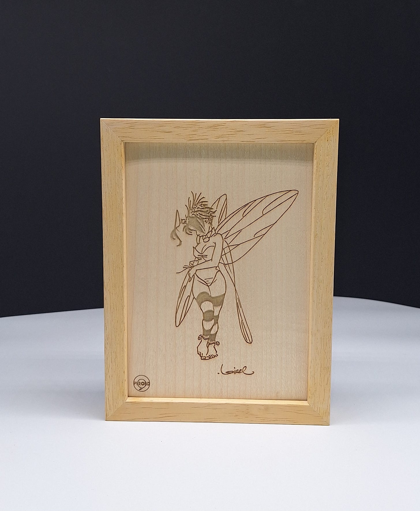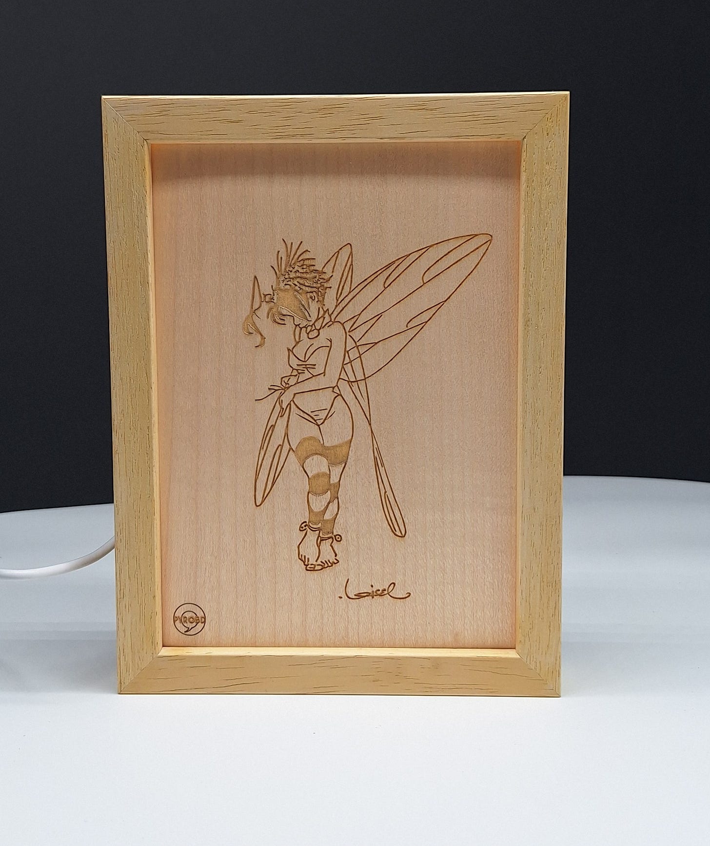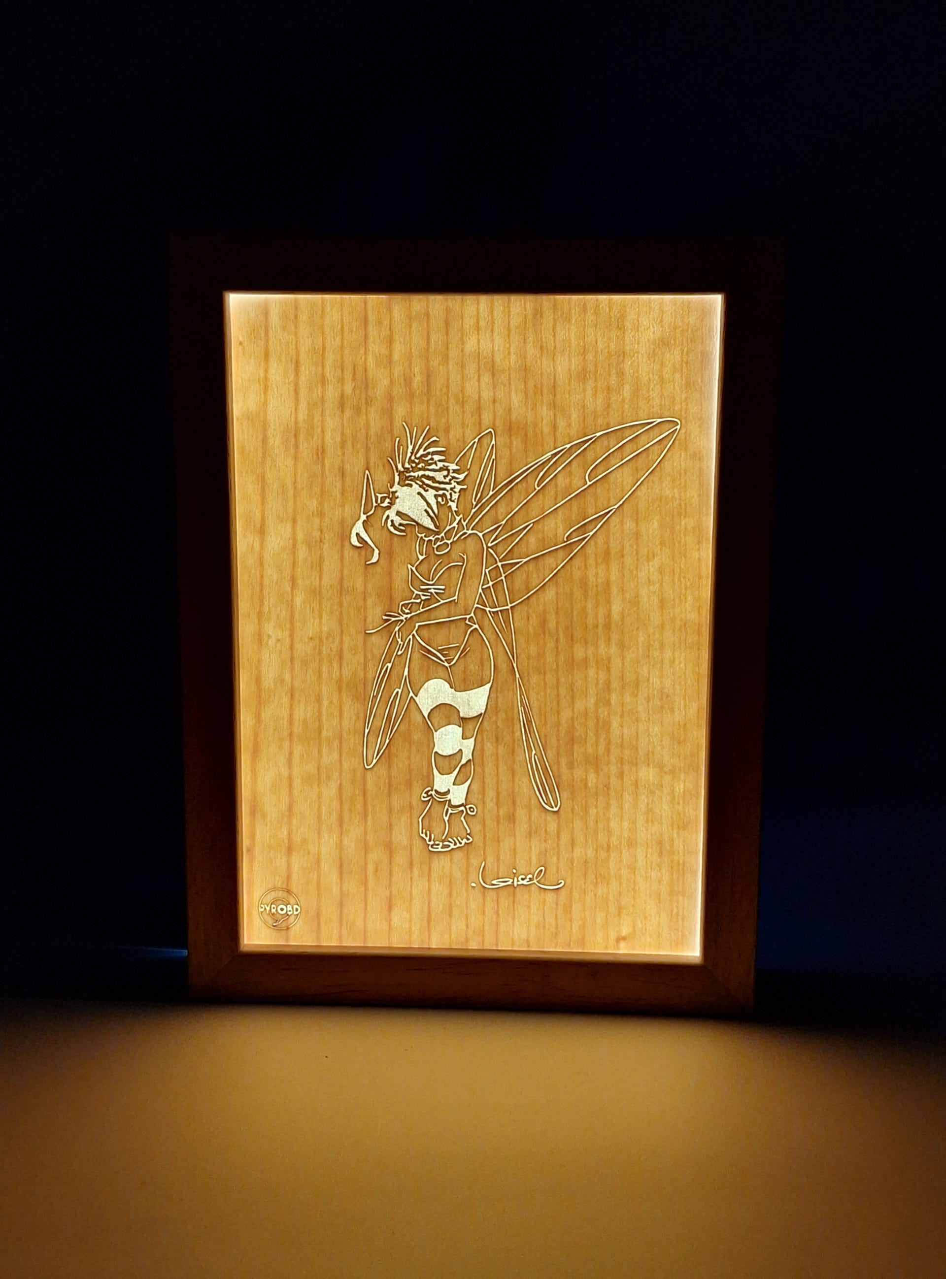 Cette gravure est réalisée sur de l’érable sycomore de 1mm d’épaisseur ce qui laisse voir la transparence avec la lumière obtenue par les leds. Ces dernières s’allument par détection de mouvements.