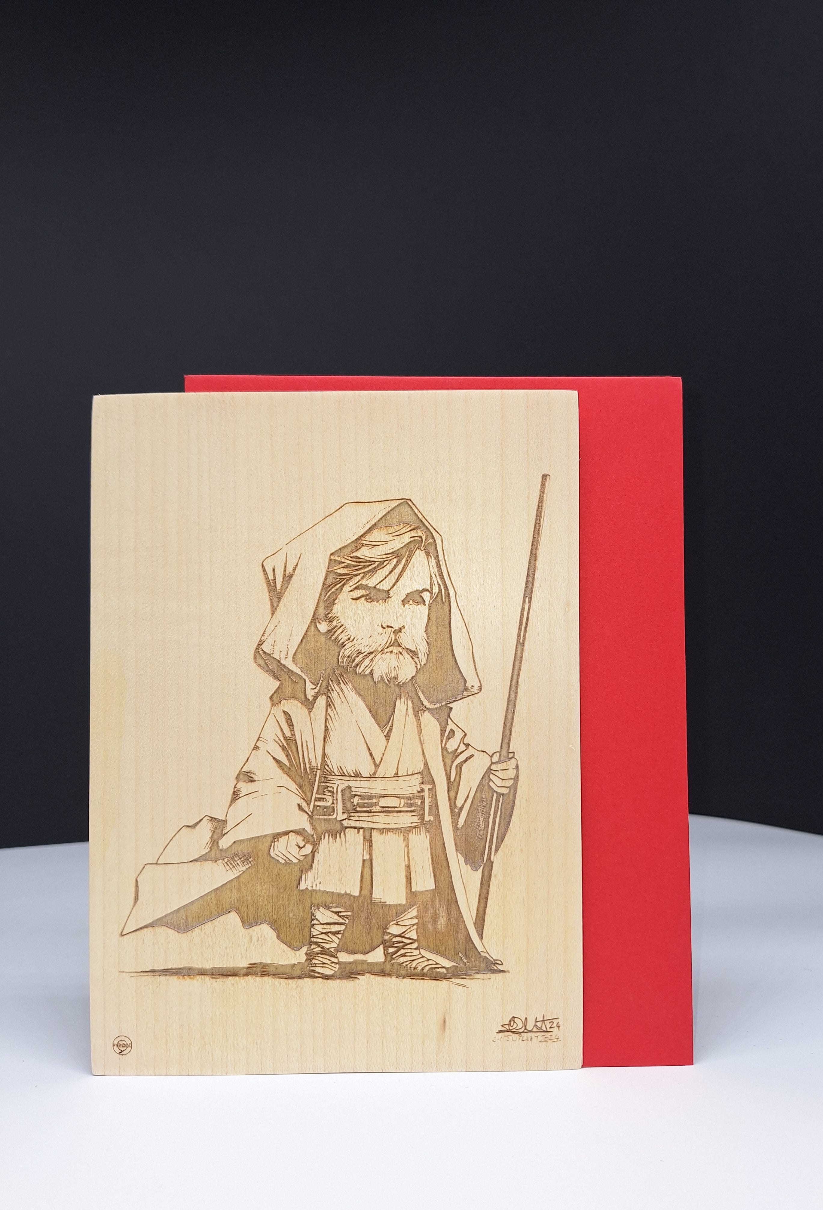 Carte gravée sur de l’érable représentant Obi Wan Kenobi à une autre époque que la première carte déjà présentée et dessinée par Sébastien Pernet.